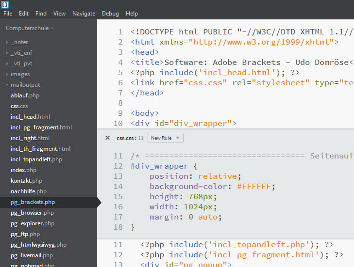 Adobe Brackets ist ein junger, Code orientierter HTML-Editor, der durch einen ungewöhnlichen Ansatz auffällt. Insbesondere das Umschalten zwischen HTML und CSS ist hier sehr effizient gelöst. Für Menschen, die mit reinem HTML-Code gut zurechtkommen, also nicht unbedingt im grafischen Modus die Seiten gestalten wollen, könnte das noch recht junge Brackets ein interessantes Werkzeug sein. Brackets ist frei verfügbar (kostenlos). In unseren Trainings werden wir dieses sehr einfach bedienbare Programm, das bisher noch in der Version 1.00 heranreift, auf jeden Fall mal ausprobieren. |