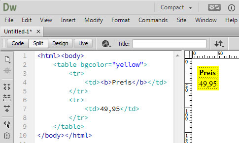 Neben Adobe Muse, welches sich zur Web-Erstellung in der Unter- und Mittelklasse eignet, gibt es mit Adobe Dreamweaver und Microsoft Expression Web zwei mächtige Programme zur Erstellung und Pflege Ihres Internetauftritts im WYSIWYG-Modus (what you see is what you get). Die Leistungsfähigkeit dieser beiden letztgenannten Programme ist in der „Oberklasse“ angesiedelt. Entsprechend sind diese Werkzeuge gespickt mit Menüs, Fenstern und Buttons! Webseiten werden in einer Beschreibungssprache (HTML) erfasst, die Sie und ich lesen können. Also braucht man zur Entwicklung von Webseiten (theoretisch) eigentlich nicht mehr als gute HTML-Kenntnisse und den einfachsten Texteditor der Welt! Warum also ein so komplexes Programm? Ein Vorteil von WYSIWYG-Editoren ist, dass sie die HTML-Befehle gleich „mitlesen“ und grafisch übersetzen, also sozusagen begleitenden Browser spielen. Auch umgekehrt kann man dann im grafischen Fenster (design modus) zum Beispiel Bilder einbauen oder Text eingeben und formatieren, und der zugehörige HTML-Code wird im Codefenster automatisch und gleichzeitig erstellt oder angepasst und auch gleich übersichtlich strukturiert. Es gibt viele weitere Vorteile. Tatsächlich wird man bei der Entwicklung anspruchsvoller Webseiten immer wieder zwischen der grafischen Anzeige und dem reinen HTML-Code hin- und herschalten. Dreamweaver und Expression Web erlauben dies sehr komfortabel. Überzeugen Sie sich selber, dass Sie ohne Spezialwerkzeuge Webseiten erzeugen können, indem Sie das Beispiel hier rechts ausprobieren: |